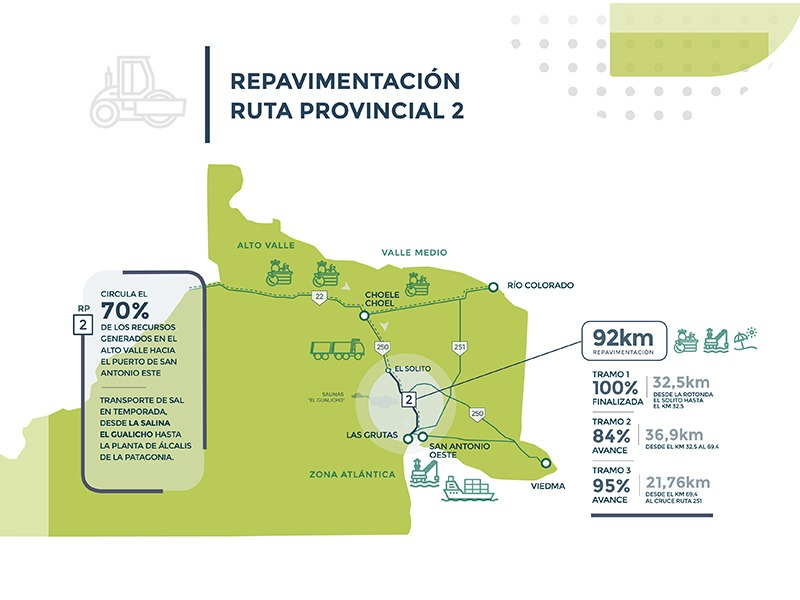 Además, Grün destacó la construcción del derivador de tránsito en el acceso a la Salina del Gualicho en la intersección con la ruta provincial N 59 y la incorporación de terceras trochas en ese sector.